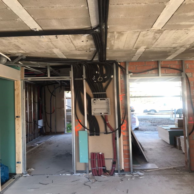 Nos ocupamos de la instalación del sistema eléctrico en todos los aspectos: eléctricos, electrónicos, mecánicos, sistemas, software, hardware, seguridad, certificación, calidad. Seguimos un protocolo riguroso y sistemático, sincronizado si es preciso con otros procesos del proyecto de obra y construcción. Interpretamos el plano de la instalación y su traslación a la obra. Fijamos el trazado del recorrido de la tubería, habilitando la tipología y tramos necesarios y procediendo a su instalación. Inserción del cableado en el sistema de tuberías.